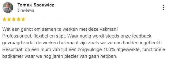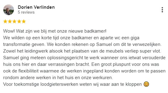 We wilden op een korte tijd onze badkamer en aparte wc een GIGA transformatie geven. We konden rekenen op Samuel om dit te verwezenlijken. Zowel het leidingwerk alsook het plaatsen van de meubels verliep super vlot. Samuel ging meteen oplossingsgericht te werk wanneer ons ietwat verouderde huis ons hier en daar verrassingen bracht. Een groot pluspunt voor ons was ook de flexibiliteit waarmee de werken ingepland konden worden om te passen rondom andere werken in het huis en onze werkuren.